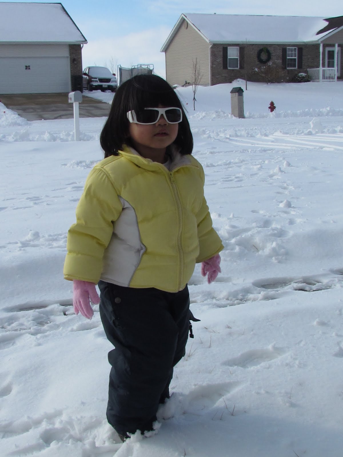 Needless to say, we got some good pictures of her enjoying the snow, donning her sunglasses (right side up mind you), making her first snow man and her perfect snow angel. All in all, I think she enjoyed her first real snow. Either way, I marked it down as a success. One I will remember for sure.